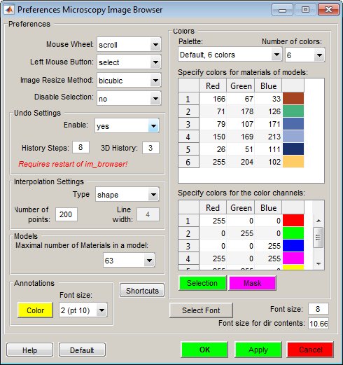 This dialog provides access to preferences of Microscopy Image Browser. Allows to modify colors of the Selection, Model and Mask layers, default behaviour of the mouse wheel and keys, settings of Undo...