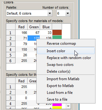 There are several built-in palettes for coloring materials of models are available. The palettes may be selected using the Palette and Number of colors comboboxes. The Default color palette was selected so that each color appears as a distinctive shade to color-blind users.