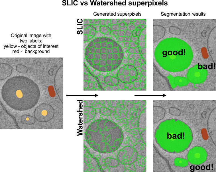 The picture above shows comparison between two types of superpixels. The upper panels show the SLIC superpixels that were good to segment a dark lipid droplet that has a good intensity contrast. The Watershed superpixels gave better segmentation of objects that were surrounded with boundaries.