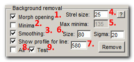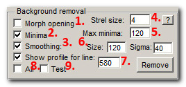 2. If the Smoothing checkbox is ON (3.), the program filters the background image with gaussian filter with Size and Sigma parameters (6.).
