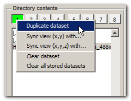 These buttons allow fast access to several datasets stored in the memory. The green color of the button indicates that there is a dataset loaded. When cursor is above the button a tooltip with the full file name appears to help with identification of the loaded dataset. The datasets may be switched using the left mouse button press on the desired button. The left mouse button shows a popup menu with additional options: