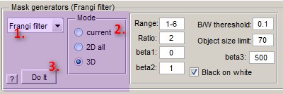 - Object size limit, after the run of the Frangi filter removes all 2D objects that are smaller than this value.