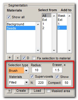 The Superpixels mode can be initiated by selecting the Watershed or SLIC checkbox. In the Superpixels mode the brush tool selects not individual pixels but rather groups of pixels (superpixels). While drawing the selection of the last superpixel can be undone by pressiong the Ctrl+Z shortcut.