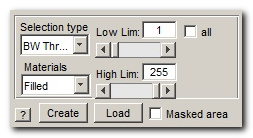 Selection of pixels with the mouse button based on their intensities. The intensity variation is calculated from the intensity of the selected pixel and two threshold values from the Threshold edit boxes.