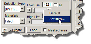 Use the Low Lim and High Lim sliders and edit boxes to provide the threshold values. If the Masked area check box is selected the thresholding is performed only for the masked areas of the image, which is very convenient for local black and white thresholding. The right mouse click above the threshold sliders opens a popup menu that allows to set the step for slider movement. |