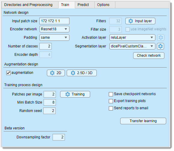- Image prediction: the trained network is saved to disk and can be used to segment new datasets via the Predict tab.