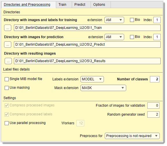 The Directories and Preprocessing tab specifies directories for training and prediction images, along with parameters for image loading and preprocessing.