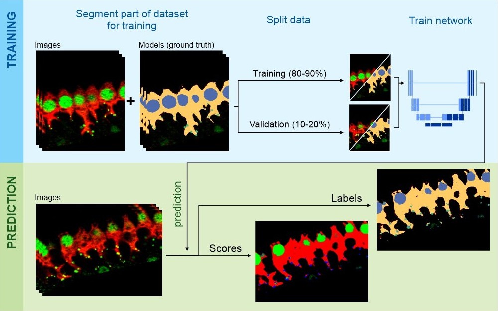 - Network training: users define the network architecture via the Network panel and provide images and ground truth labels through the Directories and Preprocessing tab. the data is split into training (most of the data) and validation sets. the network trains on the training set and evaluates performance on the validation set using the Train tab.