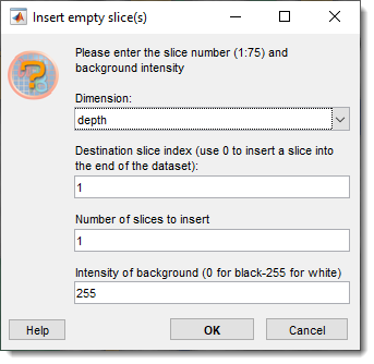 slices to insert in the field (e.g., - define the intensity or color of the new slice(s) (e.g., 0 for black, 255 for white in grayscale).