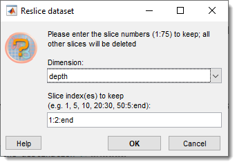 The current dataset is replaced with the selected slices, reducing the selected dimension. This is useful for downsampling a stack to reduce data size, focusing on key slices, or preparing data for preparation of dataset for training of CNNs. The image and layers are updated to include only the extracted slices, preserving their content.