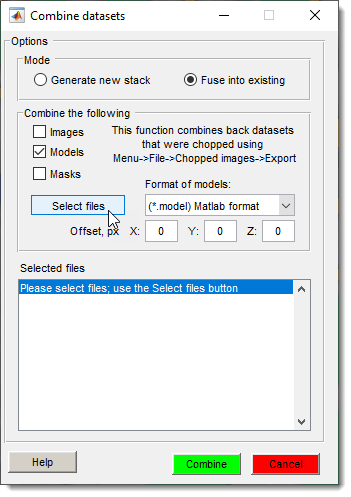 Generate new stack | Combines images, models, or masks into a new stack. Requires filenames with _Znn_Xnn_Ynn tags for images and Labels_ prefixes for models (default for chopped exports). |
