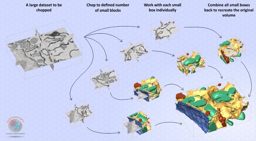 The Chopped Images tool in MIB allows you to split a large dataset into smaller pieces and later restore them. This feature is useful for parallel segmentation of large datasets across multiple workstations.