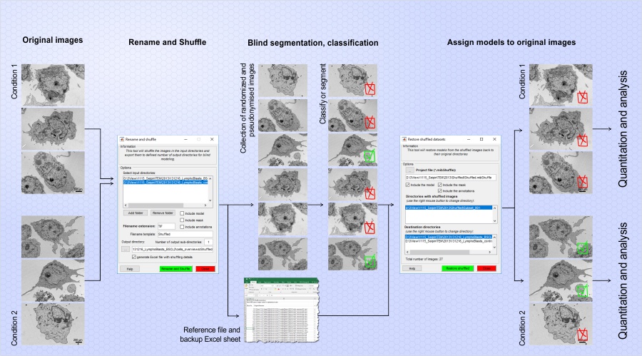 The Rename and Shuffle tool in Microscopy Image Browser (MIB) shuffles files for blind modeling or classification, ensuring users don’t know which file corresponds to which condition. Models from shuffled files can later be restored to their original filenames for analysis.