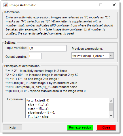 Apply custom arithmetic expressions using MATLAB syntax to modify the Image, Model, Mask, or Selection layers of the dataset.