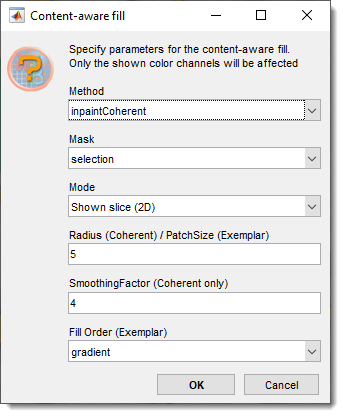 - specify whether the content aware fill should be applied for the current slice or the whole dataset