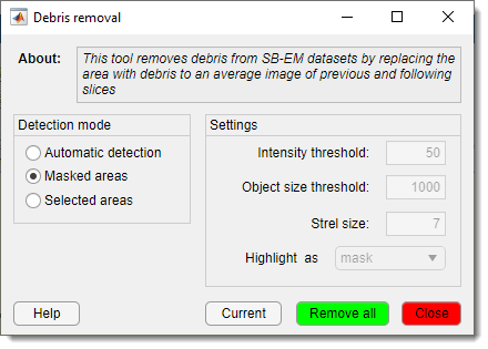 Select a debris removal mode from the Segmentation panel. Configure parameters as needed, then click the button to restore the affected areas on the current slice or across the dataset.