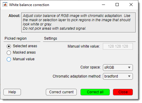 dropdown, with options Bradford, von Kries, or simple.Select the correction scope using the