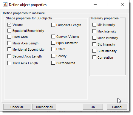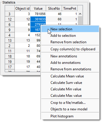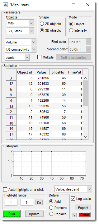 This dialog provides access to statistic values for shapes and intensities of model and mask 2D or 3D objects.