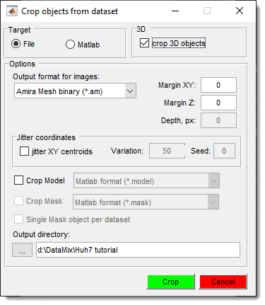 - Crop to a file/MATLAB: crops the dataset based on 3D objects, with options for margins, Model/Mask cropping, and export to file or MATLAB.