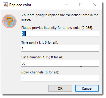 Replaces image intensities in selected areas with new values. A dialog prompts for intensities, slices, and color channels.