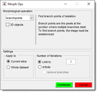 Performs morphological operations on 2D and 3D objects in the Selection layer. See MATLAB’s bwmorph, bwmorph3, and bwskel functions for details.