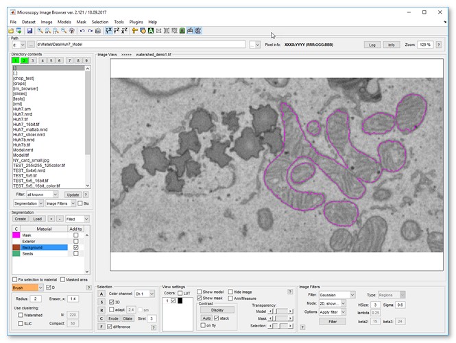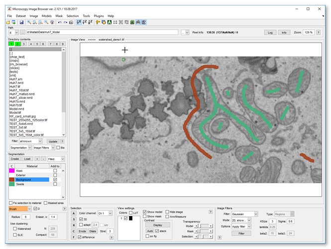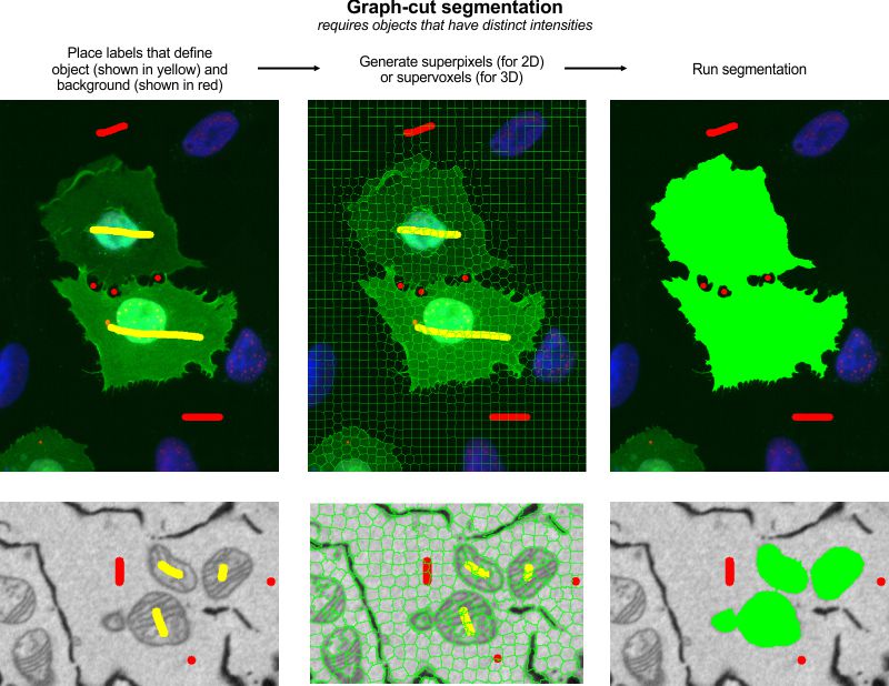Semi-automated image segmentation using the max-flow/min-cut graphcut method in Microscopy Image Browser (MIB).