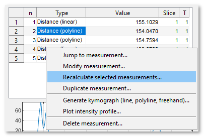 - Recalculate selected measurements...: updates distances and intensity profiles if pixel size or color channels change.