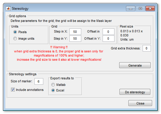 Counts intersections between model materials and grid lines, with spacing definable in pixels or image units. Results can be exported to MATLAB or Excel.