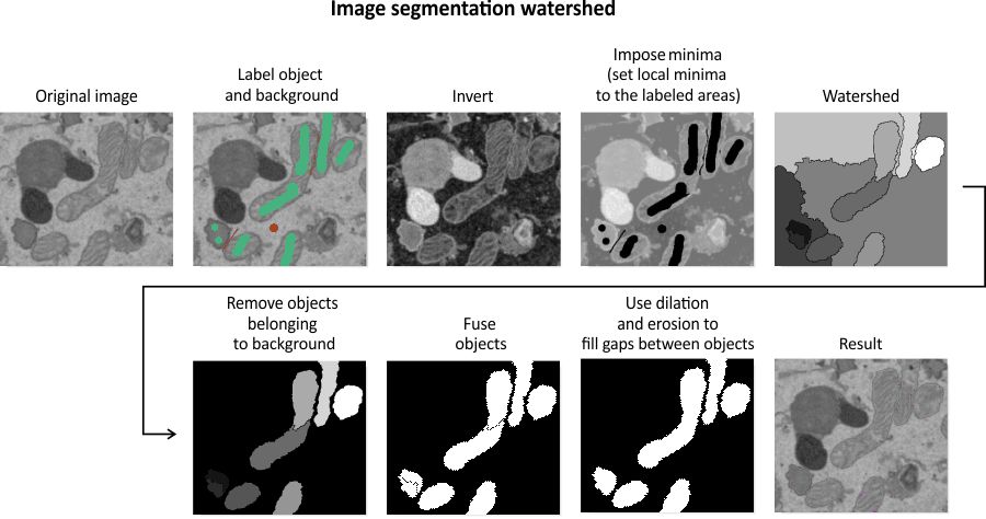The diagram illustrates the step-by-step process of the Watershed segmentation algorithm, transforming labeled input into segmented objects.