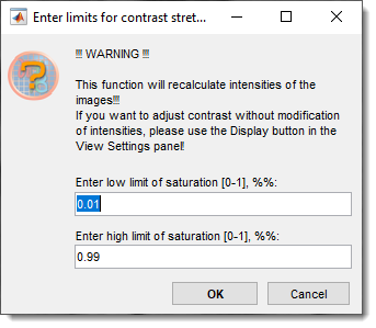 - : adjusts brightness across the entire dataset, prompting for saturation parameters (low/high intensity borders). This recalculates image intensities to boost contrast.